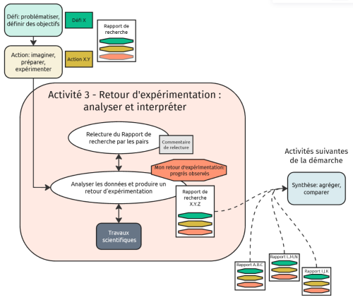 L'activité 3 - Retour d'expérimentation est divisée en plusieurs tâches listées ci-dessous. Ces tâches s'appuient sur un guide pour la préparation de la mise en place d'une Action, un modèle à remplir pour écrire le Retour d'expérimentation et une trame de relecture pour guider des suggestions d'amélioration par les pairs.