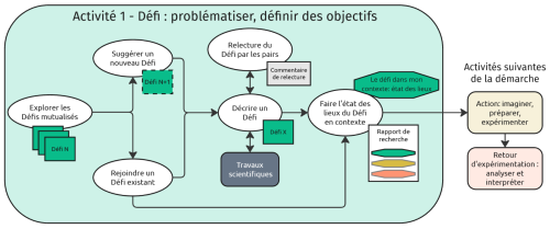 L'activité 1 - Défi est divisée en plusieurs tâches listées ci-dessous. Ces tâches s'appuient sur un modèle à remplir pour décrire le Défi et sur une trame de relecture pour guider des suggestions d'amélioration par les pairs.